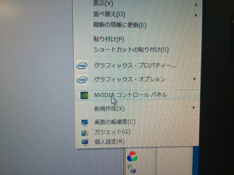 設定を変更するには、画面何もない場所で右ボタン、NVIDIAコントロールパネル
